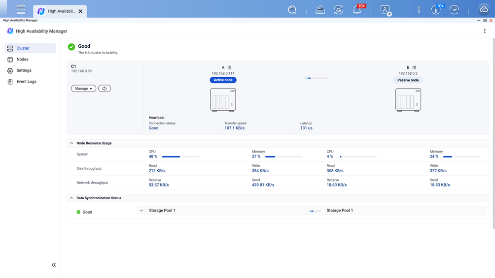 Once setup is complete, the High Availability App homepage shows the cluster created by the two NAS units, named “C1” (the name can be customized during configuration). The homepage resembles a dashboard, listing the status of both the active and passive nodes, including CPU and DRAM usage, disk read/write speeds, individual network connection speeds, and the transfer speed and latency between the two NAS devices.