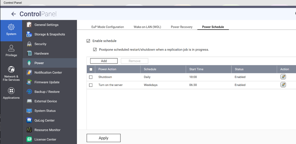 Conversely, for a NAS that has been shut down properly, these options will only take effect if it experiences a power outage and subsequent restoration while turned off. In this case, unless you use a smart plug to remotely cut and restore power, the only way to turn on the NAS remotely is through Wake-on-LAN (WOL).