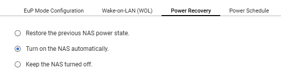 The scheduled power-on method has already been introduced in the previous section. In the same settings interface, there is also a “Power Recovery” option. Similar to settings found on most computer motherboards, this feature determines how the NAS responds when power is restored after an outage.