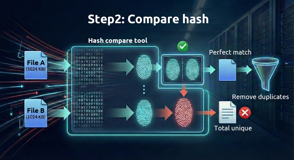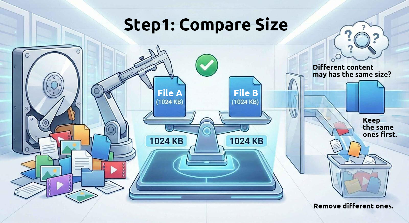 Given the high reliability of hash comparisons, why is it still necessary to check file sizes first? Doing so helps save time and resources. Comparing hash values is computationally intensive, but identifying files with identical sizes is almost effortless for modern computers. By first narrowing down the number of files based on size before performing hash comparisons, the process becomes much more efficient.