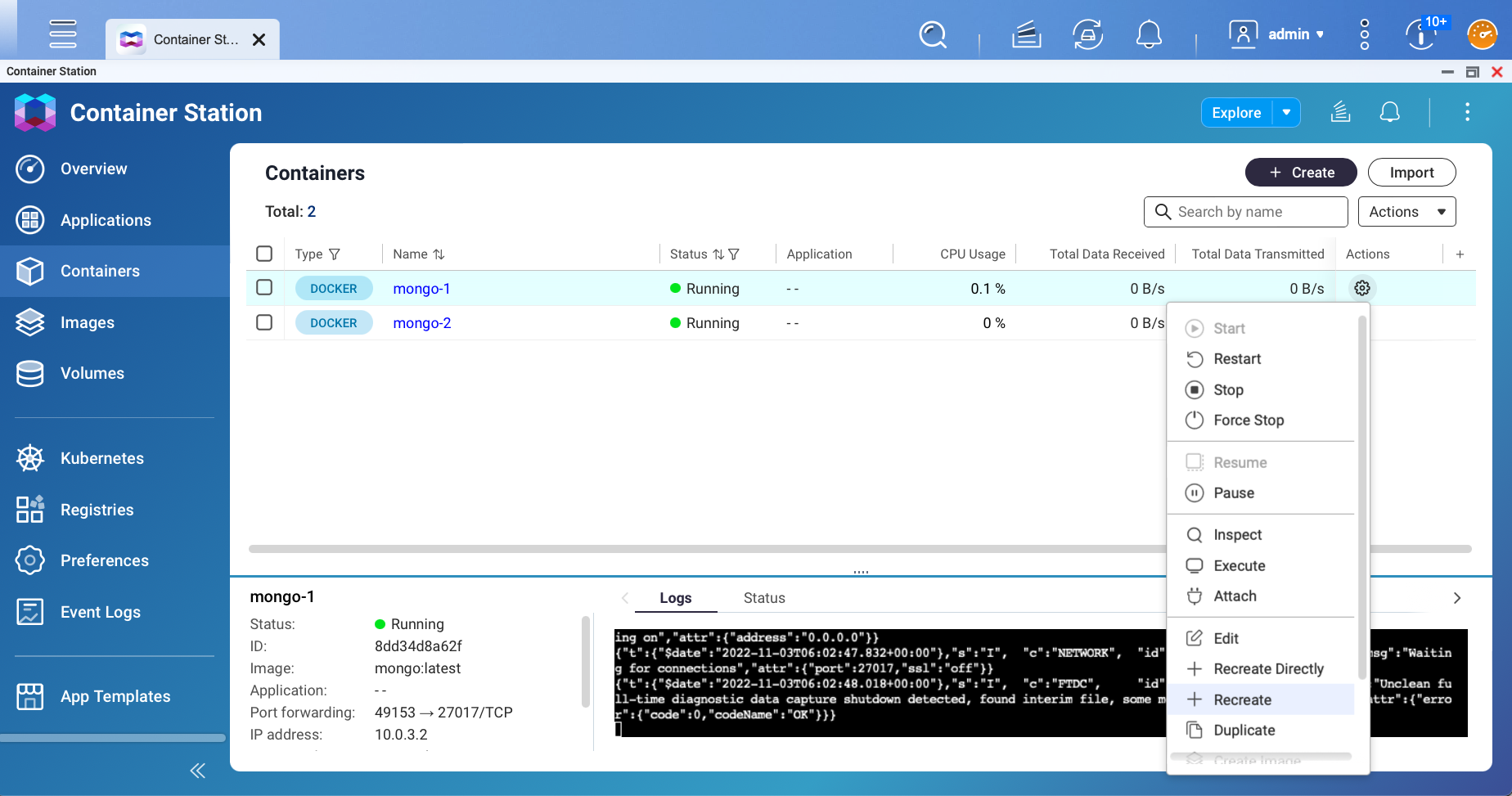 Container Station 3.0: 실행 중이거나 중지된 컨테이너를 다시 생성하여 온라인으로 구성을 변경하고 실시간으로 업데이트합니다.