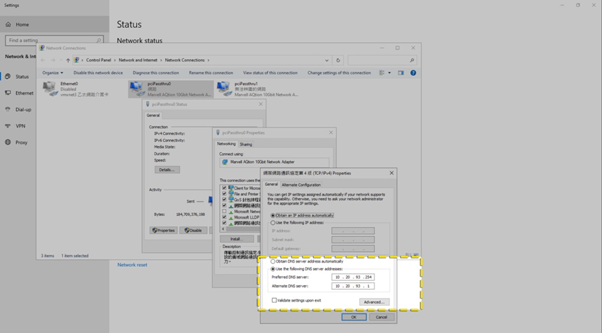 修改Windows Server 系統上的 DNS IP 為 10.20.93.254 (#替換成你上面設定的 Pi-hole IP)