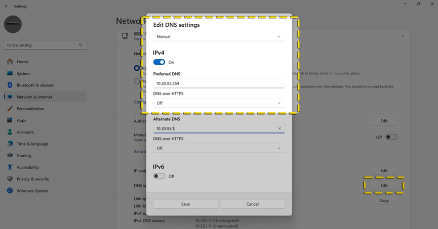 修改Windows 11上的 DNS IP 為 10.20.93.254 (#替換成你上面設定的 Pi-hole IP)