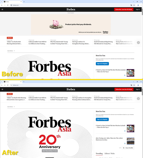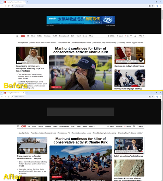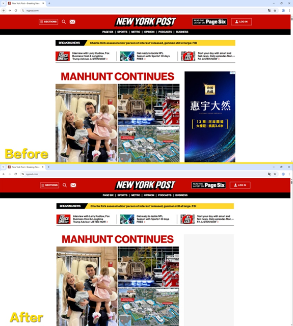 - Before:打開新聞網站,滿滿的橫幅廣告、彈窗、影片前置廣告。