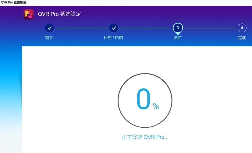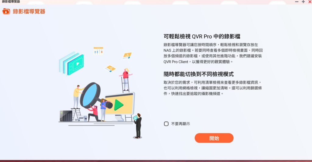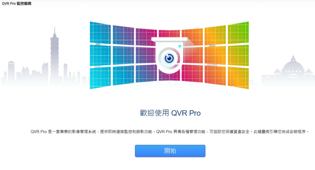 安裝啟動: 從 App Center,如上圖所示,輕鬆找到並啟動 QVR Pro,點擊「開始」即可進入初始化設定,如下圖所示。
