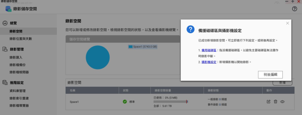 在成功完成錄影空間的配置,如上圖,系統會提示進行備援磁碟區和攝影機設定,如下圖。這個步驟非常關鍵,它確保了影像資料的第一手儲存,並且為攝影機的加入做好了準備。圖中顯示 Space1 已成功就緒,總容量 5.61 TB,所有資料都將安全地保留在我們在本地端的 NAS 上。