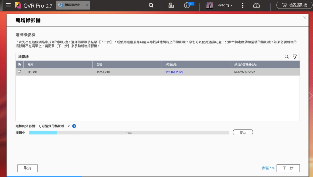 自動掃描: 點擊「新增攝影機」後,QVR Pro 會在區域網路中自動搜索可用的攝影機,並列出製造商、型號和網路位址,如上圖所示。這個案例中,它發現了 TP-Link Tapo C210,展現了對市場上主流 ONVIF 設備的良好支持。
