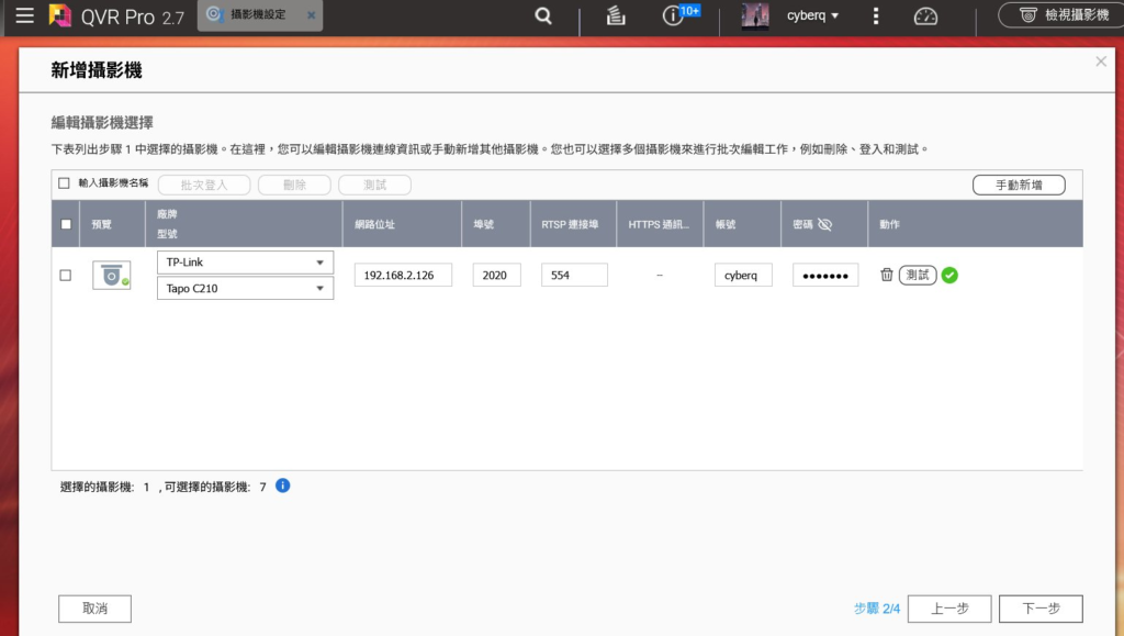 登入與測試: 接著,我們要輸入攝影機的登入帳號和密碼,如上圖所示,並可進行測試連線,確認 QVR Pro 能夠成功取得影像串流。這些認證資訊儲存在本地,不會經手外部雲端服務,進一步保障了系統的安全性。