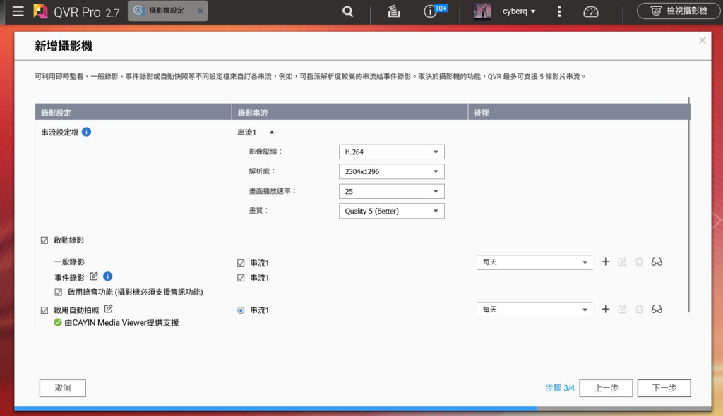 畫質與編碼控制: 在「新增攝影機」的步驟 3/4,如上圖所示,我們可以針對不同的錄影需求,設定不同的串流配置。例如,選擇 H.264 編碼格式、調整解析度(如圖中的 2304×1296)和畫面播放速率(如 25 fps),以平衡畫質、檔案大小和網路頻寬需求。
