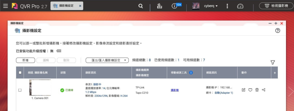 即時連線概覽: 攝影機成功加入後,如上圖所示,我們能在「攝影機設定」總覽頁面看到詳細資訊,如下圖所示,包括連線狀態、錄影串流速率(如 1.2 Mbps)、解析度,以及攝影機的 IP 位址。目前已使用頻道數為 1 個,總頻道數為 8 個,管理一目瞭然。