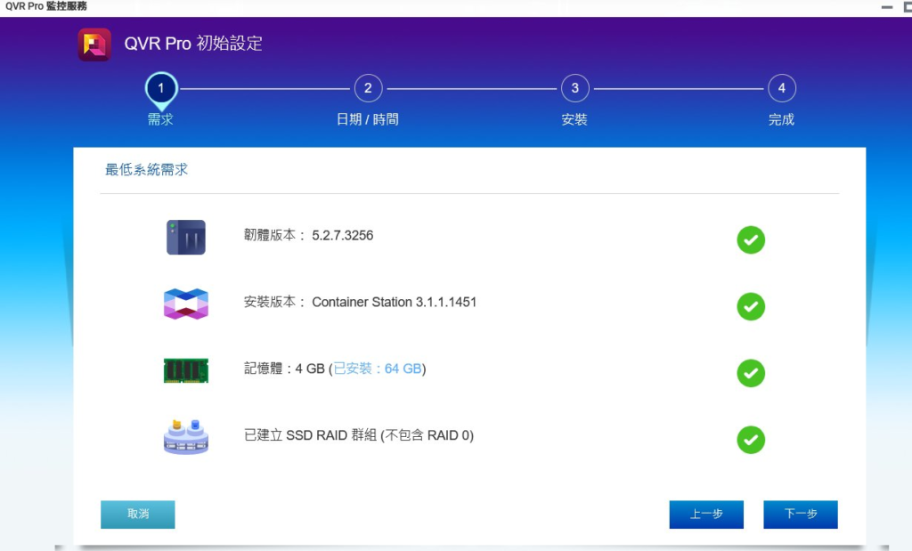 系統檢查: 系統會自動檢查最低需求,如下圖所示,確保作業系統版本(如 QTS 5.2.7)、Container Station 和必要的記憶體(如圖中顯示 64 GB)和 SSD/RAID 群組都符合要求,為穩定的監控服務打下基礎。