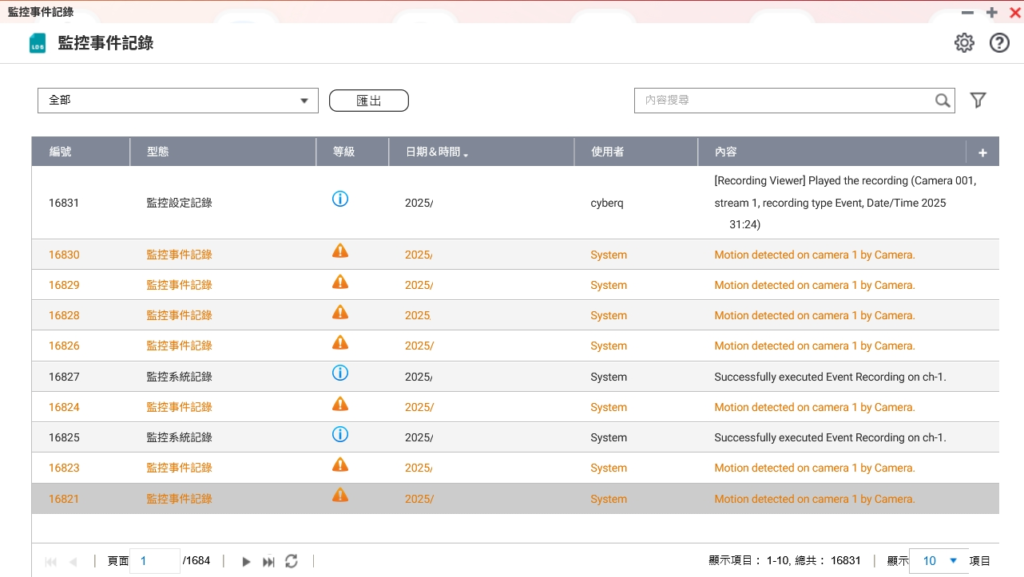 從上圖的監控事件紀錄中,店長或工廠管理人可以快速依據偵測到的人體移動紀錄來找影片檔,也可以從影片檔的自動偵測儲存檔案中找資料。