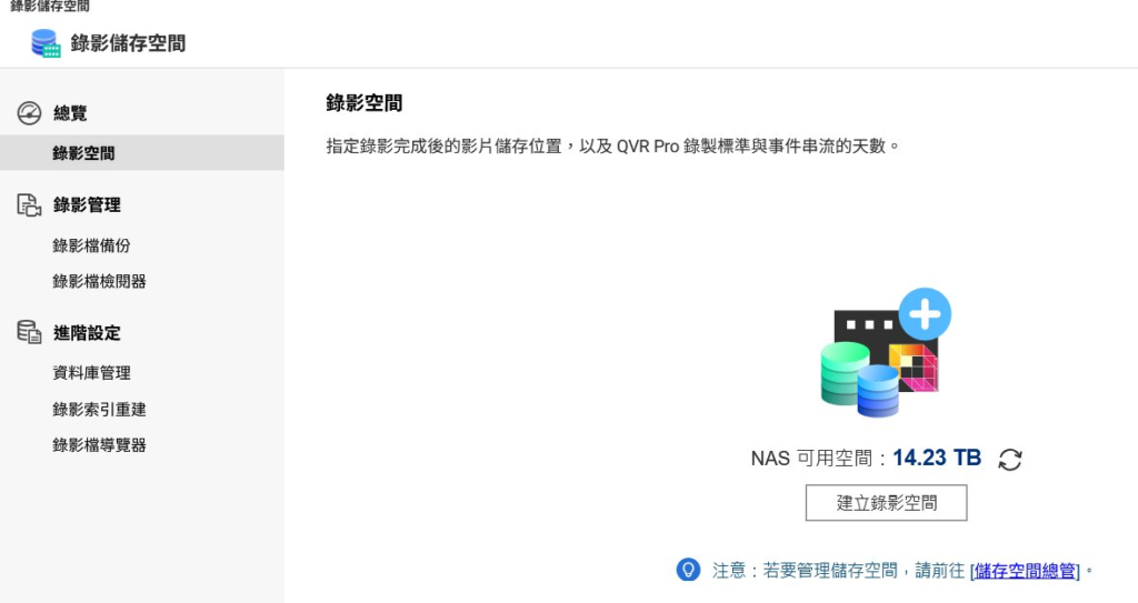 本地專屬儲存(Local Storage): 在「錄影儲存空間」頁面中,如上圖所示,可以看到 NAS 的可用空間(例如圖中的 14.23 TB),並可專門為監控紀錄劃分錄影空間。