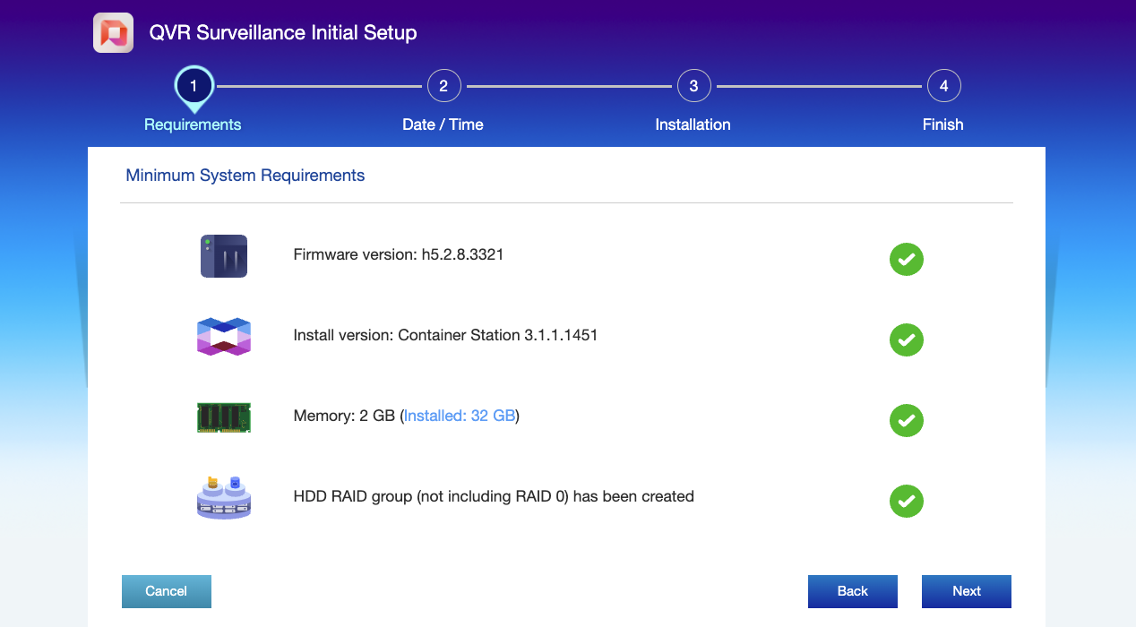 系統檢查: 系統會自動檢查最低需求,確保作業系統版本、Container Station、記憶體和 HDD RAID 群組都符合要求,為穩定的監控服務打下基礎。