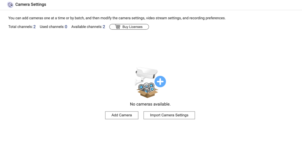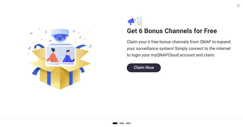 資料儲存是資安的關鍵環節。QVR Surveillance 強調錄影儲存空間的管理,確保影像資料全程由我們來掌控,顯示預設裝好 QVR Surveillance 可以納管共 2台監控攝影機,另外可以透過線上領取額外 6 個頻道的額度,總共可以納管 8 台監控攝影機,已經足夠大部分環境中使用,如果需要更多攝影機納管,就需要購買安裝升級授權,可以有更多數量的攝影機納入。