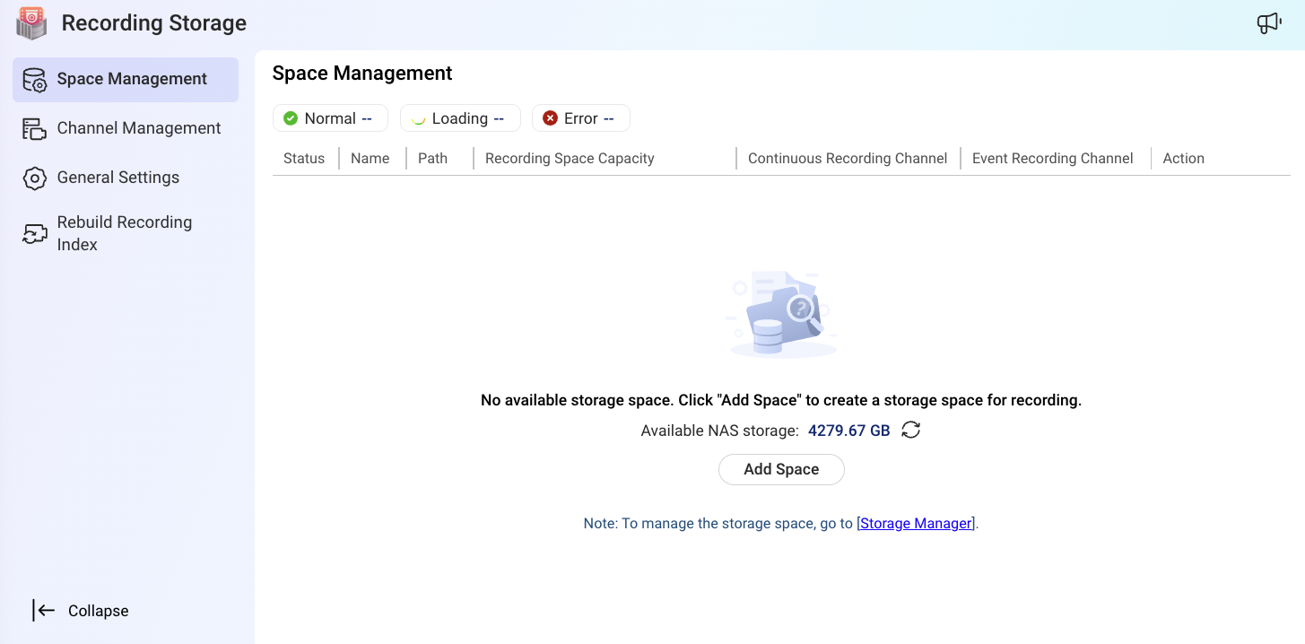 本地專屬儲存(Local Storage): 在「錄影儲存空間」頁面中,可以看到 NAS 的可用空間(例如圖中的 4279.67 GB),並可專門為監控紀錄劃分錄影空間。