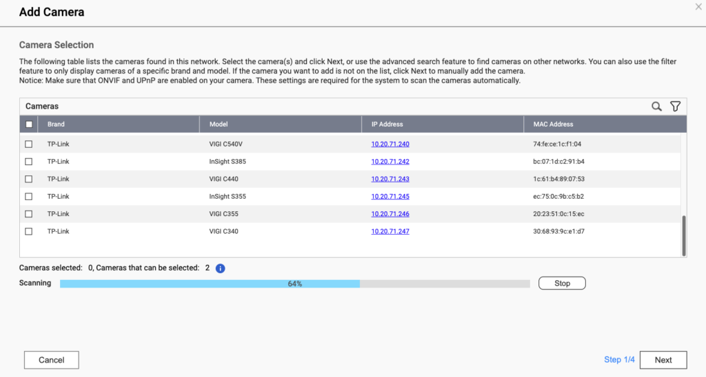 自動掃描: 點擊「新增攝影機」後,QVR Surveillance 會在區域網路中自動搜索可用的攝影機,並列出製造商、型號和網路位址。這個案例中,它發現 TP-Link VIGI C340 等裝置,展現對市場上主流 ONVIF 設備的良好支持。