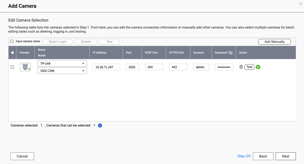 登入與測試: 接著,我們要輸入攝影機的登入帳號和密碼,並可進行測試連線,確認 QVR Surveillance 能夠成功取得影像串流。這些認證資訊儲存在本地,不會經手外部雲端服務,進一步保障系統的安全性。