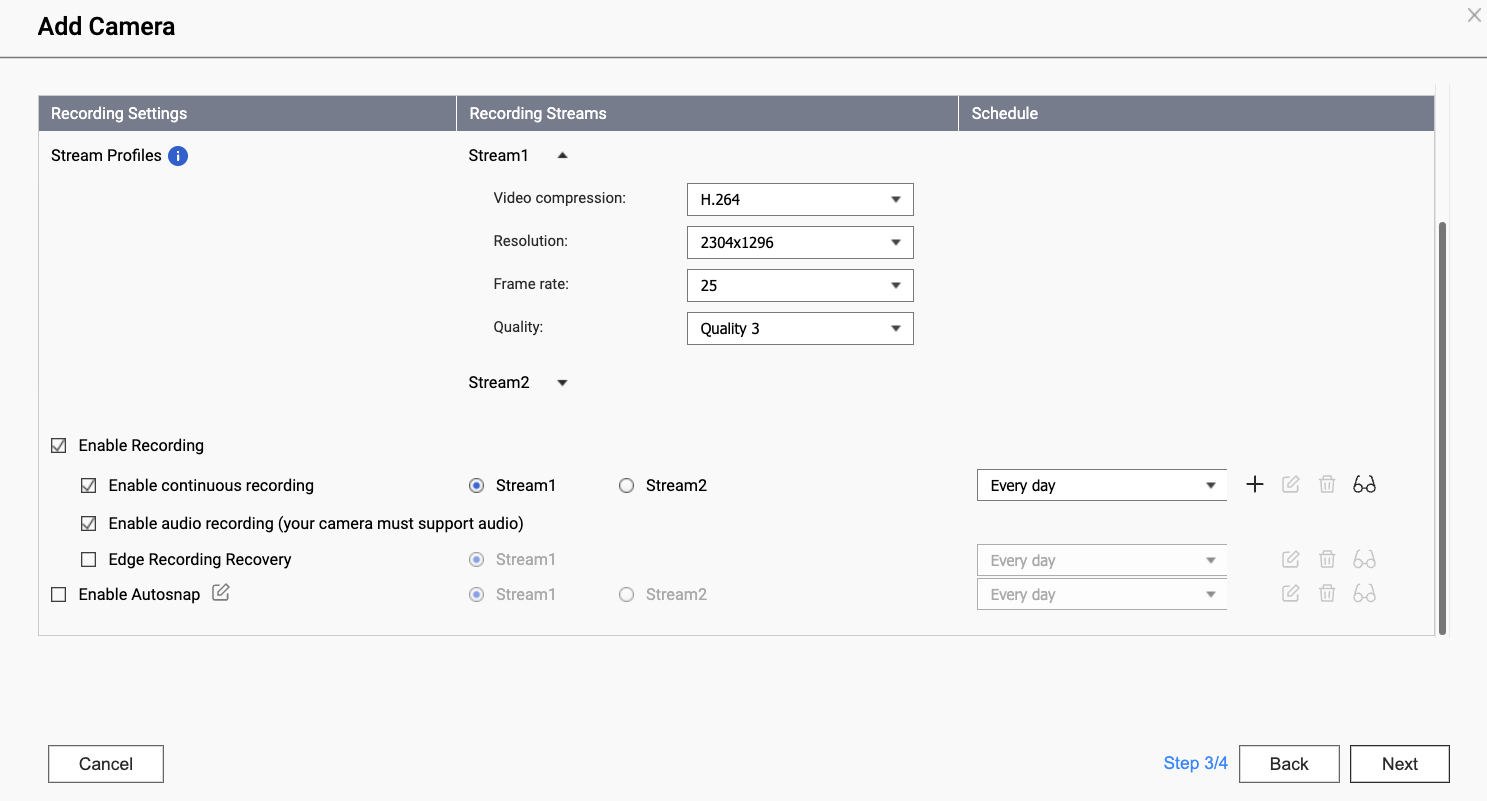 畫質與編碼控制: 在「新增攝影機」的步驟 3/4,如上圖所示,我們可以針對不同的錄影需求,設定不同的串流配置。例如,選擇 H.264 編碼格式、調整解析度(如圖中的 2304×1296)和畫面播放速率(如 25 fps),以平衡畫質、檔案大小和網路頻寬需求。