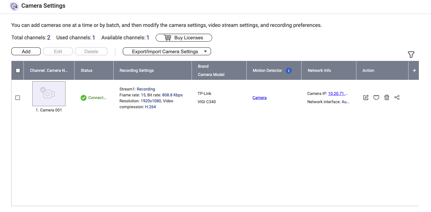 即時連線概覽: 攝影機成功加入後,我們能在「攝影機設定」總覽頁面看到詳細資訊,如下圖所示,包括連線狀態、錄影串流速率、解析度,以及攝影機的 IP 位址。目前已使用頻道數為 1 個,總頻道數為 2 個,管理一目瞭然。