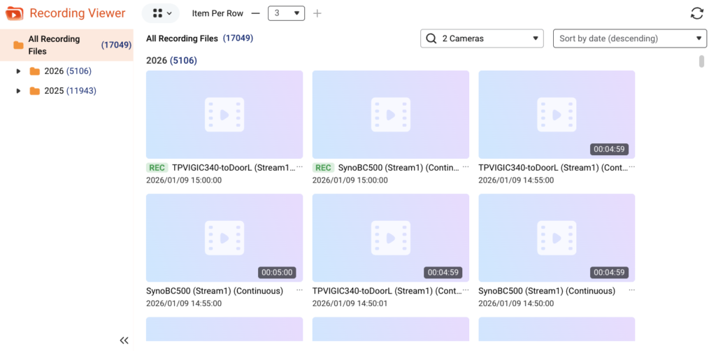 錄影檔案導覽器: 所有的安全紀錄都可透過「錄影檔導覽器」輕鬆存取與瀏覽。使用者可以依據時間、日期,如下圖中 可以挑選不同年月日的錄影,從攝影機錄影檔中進行快速篩選,隨時調閱本地儲存的完整紀錄,確保事證完整且不外流。