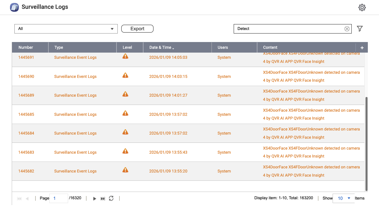 QVR Surveillance 也可以輸出偵測紀錄檔為 csv 格式方便交換與其他應用。