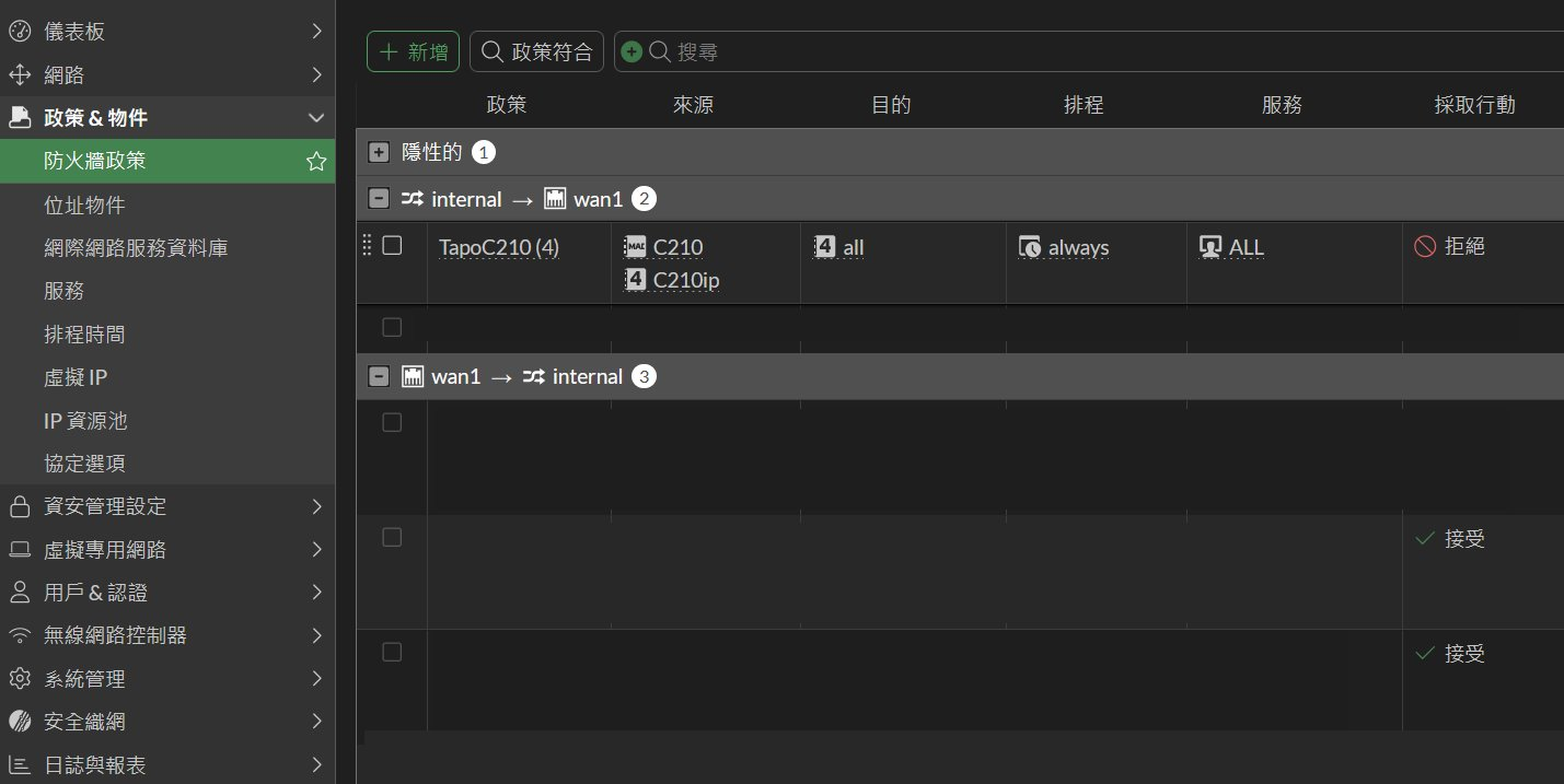 如果希望它都不要傳資料出去,那會需要做的事情除了透過 ONVIF 規格給各家品牌的 NAS 或自己的電腦納管外,還需要在你辦公、工廠產線或居家對外的路由器、防火牆上設定規則,指定這個設備的對外連線都關閉,不讓外人能夠連線近來,如下圖所示 :