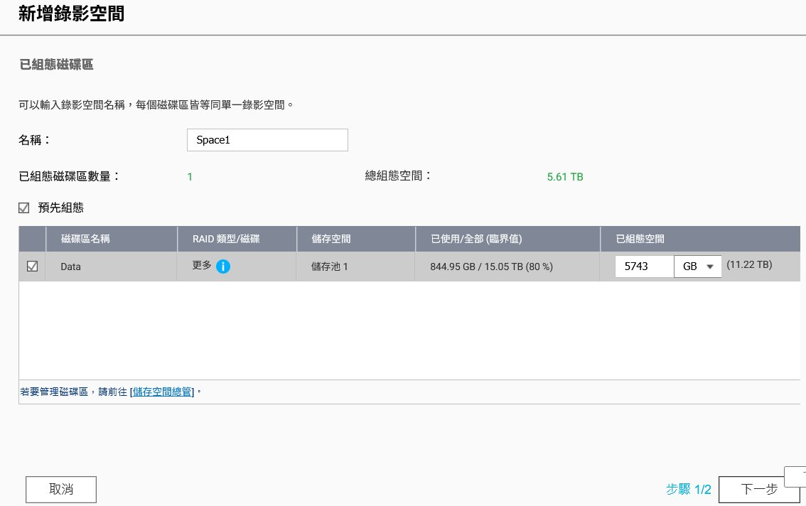 精確分配與管理: 我們可以選擇既有的儲存池,如上圖所示,將儲存池 Data 的一部分空間劃分為 Space1,明確定義錄影檔案的存放位置和最大容量。這不僅是儲存管理,更是資料主權的體現,所有影像都不會未經允許離開我們的本地設備 NAS 。