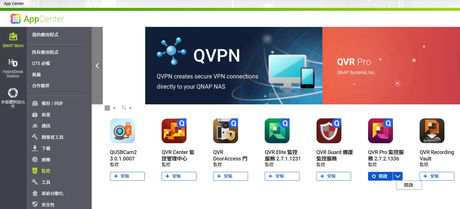 安裝啟動: 從 App Center,如上圖所示,輕鬆找到並啟動 QVR Pro,點擊「開始」即可進入初始化設定,如下圖所示。