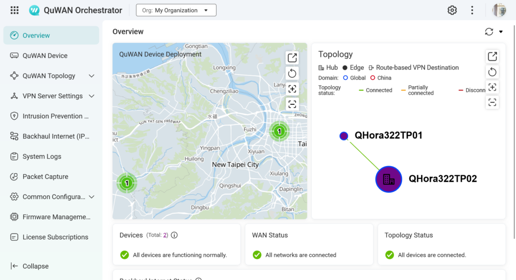 圖說一:透過雲端的 QuWAN Orchestrator 平台,管理者可以一目了然地掌握所有納管的 QHora 路由器地理位置與拓撲狀態,實現跨分點的集中化管理。