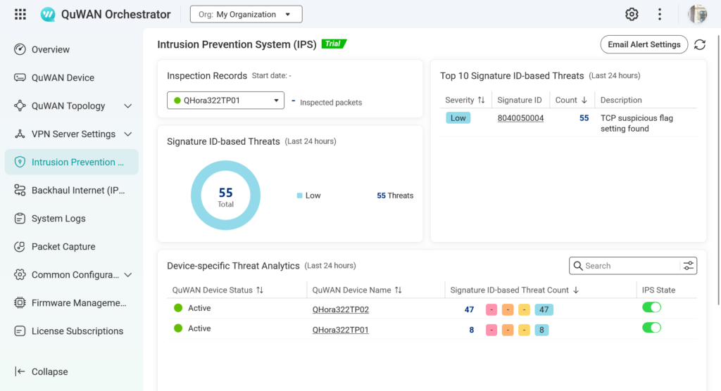 從 QuWAN Orchestrator 的管理介面中可以看到,IPS 功能已經能有效運作。如下圖所示,系統在過去 24 小時內已偵測到 55 次低風險威脅,並識別出「TCP suspicious flag setting found」這類可疑行為。這證明了即便在看似正常的網路活動中,IPS 依然能發揮其偵測異常流量的價值。