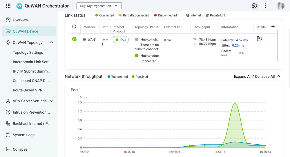 圖說五:管理者能透過平台即時監控各個 WAN 埠的詳細資訊,包含網路吞吐量、延遲 (Latency)、抖動 (Jitter) 與封包遺失率 (Packet loss),確保連線品質。
