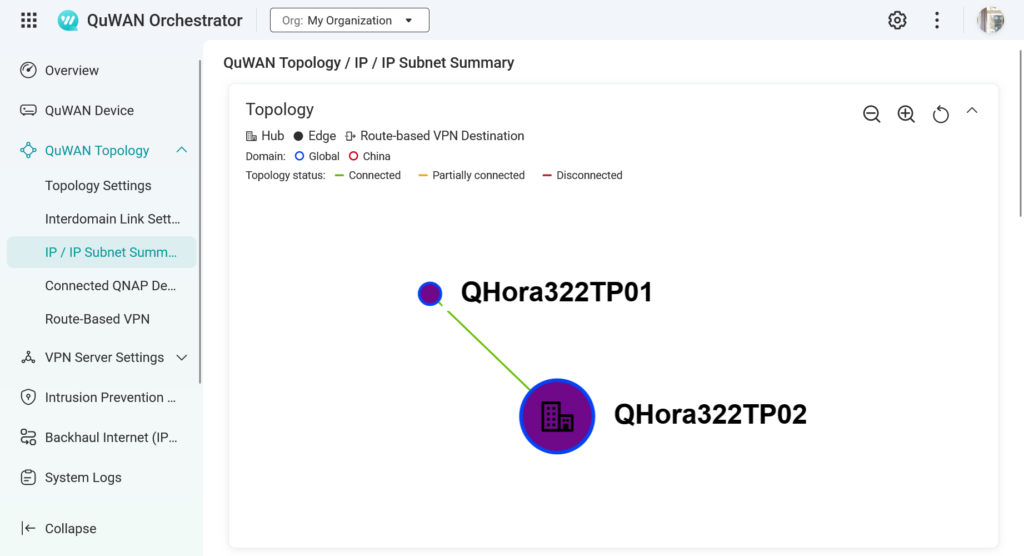 圖說四:在 QuWAN 的拓撲檢視中,總部 (Hub) 的 QHora322TP02 與分點 (Edge) 的 QHora322TP01 之間的連線狀態清晰可見,建構出安全的 SD-WAN 網路。
