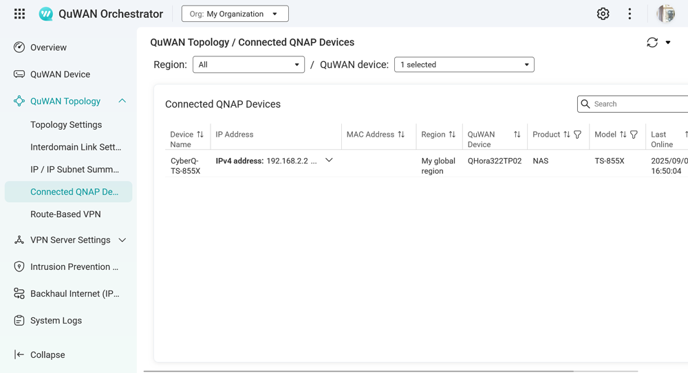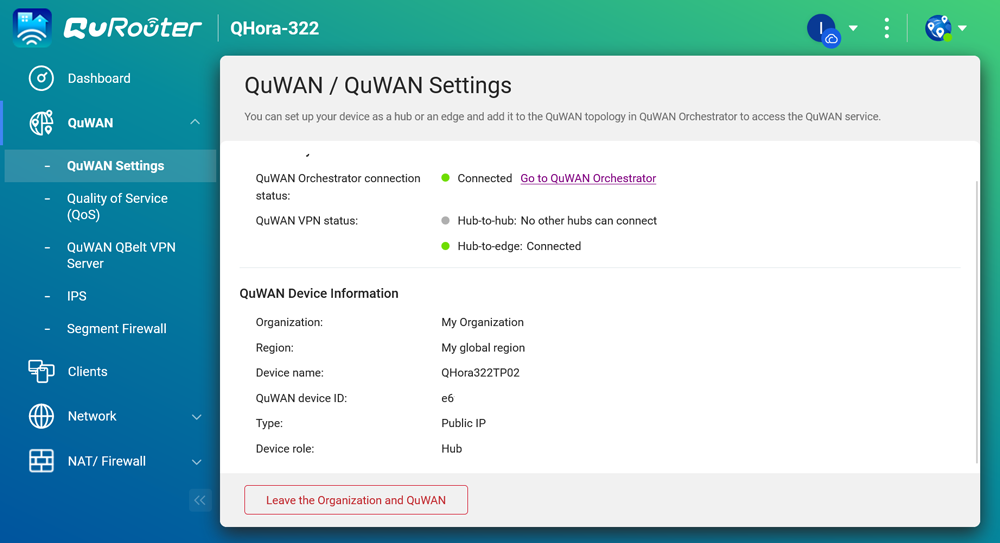 圖說十:在 QHora 的本地管理介面中,可以清楚看到此設備在 QuWAN 架構中的角色為「Hub」(總部),並已成功連接至 Orchestrator 雲端平台,實現了 Hub-to-edge 的安全連線。