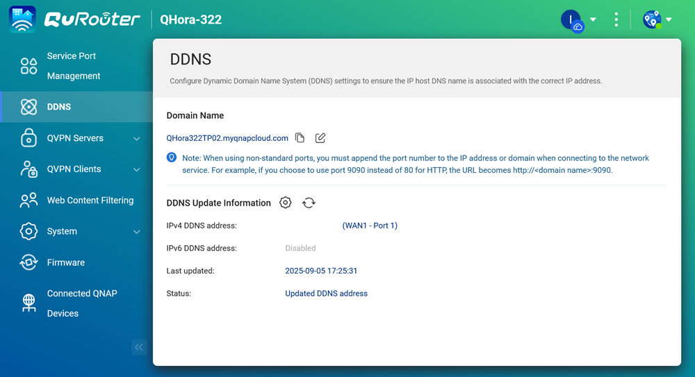 圖說八:對於使用非固定制 IP 的企業環境,內建的 DDNS 功能至關重要。QHora 路由器能與 myQNAPcloud 服務整合,將浮動的 WAN IP 綁定至一組好記的網域名稱,簡化遠端存取 VPN 或其他網路服務的設定。