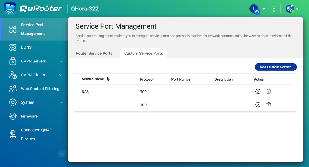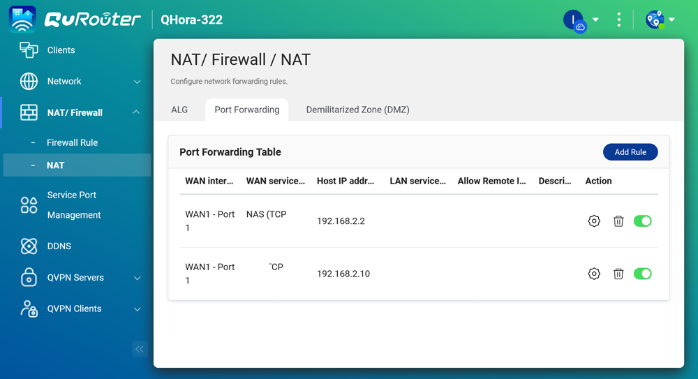 圖說十七:除了預設的服務埠,QHora 也支援精細的 NAT 通訊埠轉發規則。更重要的是,它允許管理者設定「允許的遠端 IP」,這代表管理者可以指定僅有來自特定 IP 位址的流量才能存取內部服務,相較於對全網際網路開放,此功能可大幅強化安全性,有效縮小攻擊面。