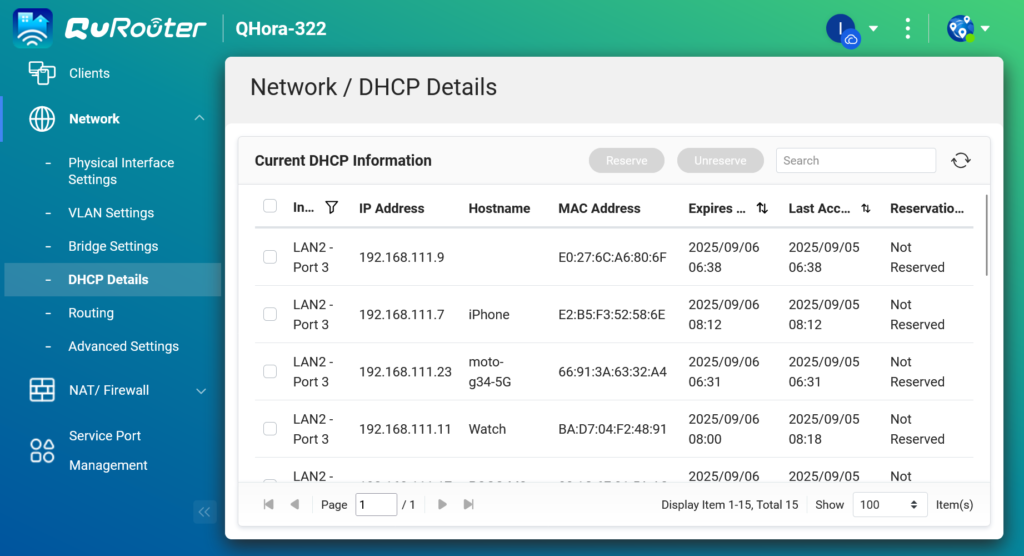 圖說十四:內建的 DHCP 伺服器詳細列出了所有已連線的客戶端設備,包含其 IP 位址、主機名稱與 MAC 位址。管理者能由此完全掌握內部網路的使用狀況,並可針對特定設備進行 IP 保留設定。