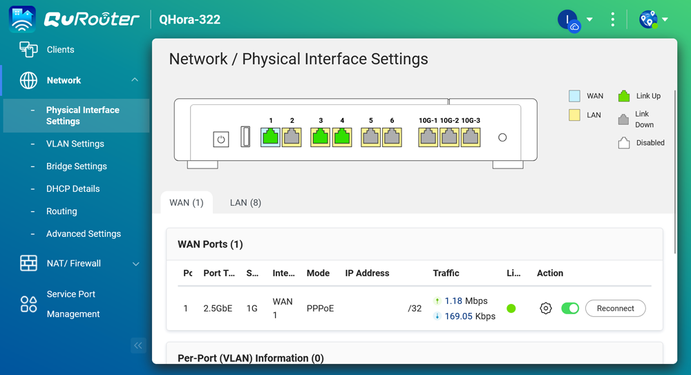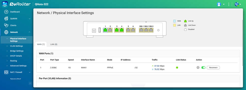 圖說十五:在網路的實體介面設定中,QHora-322 提供了非常直覺的圖形化介面,讓管理者能一眼判斷各個連接埠的狀態。此圖顯示 Port 1 作為 WAN 埠,類型為 2.5GbE,並能即時監看上傳與下載流量。