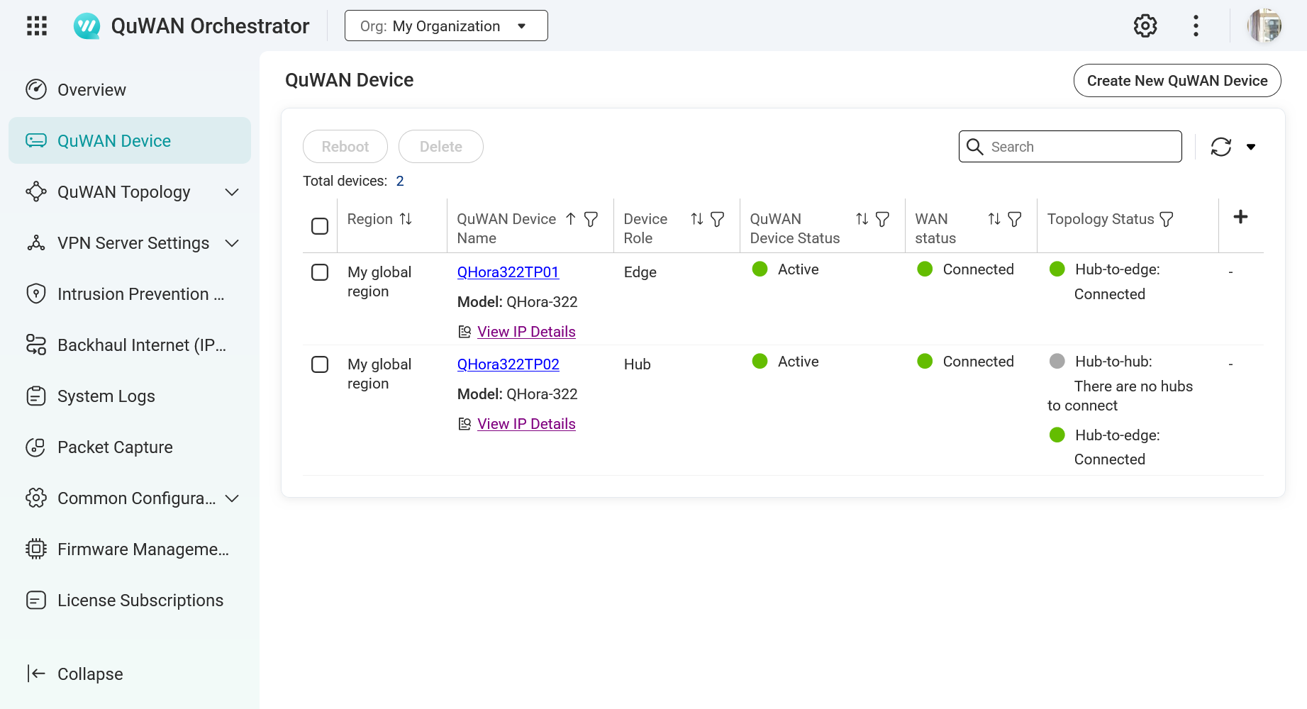 圖說四:在 QuWAN 的拓撲檢視中,總部 (Hub) 的 QHora322TP02 與分點 (Edge) 的 QHora322TP01 之間的連線狀態清晰可見,建構出安全的 SD-WAN 網路。