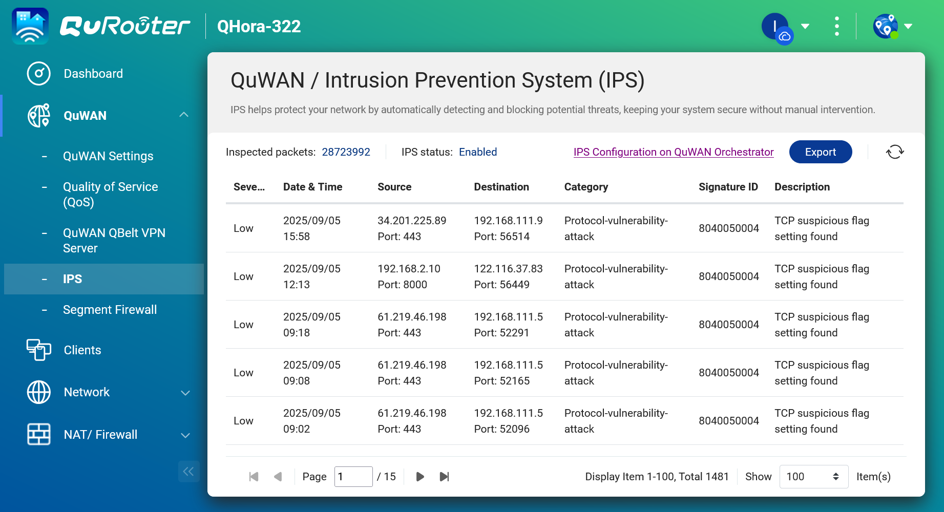 從 QuWAN Orchestrator 的管理介面中可以看到,IPS 功能已經能有效運作。如下圖所示,系統在過去 24 小時內已偵測到 55 次低風險威脅,並識別出「TCP suspicious flag setting found」這類可疑行為。這證明了即便在看似正常的網路活動中,IPS 依然能發揮其偵測異常流量的價值。
