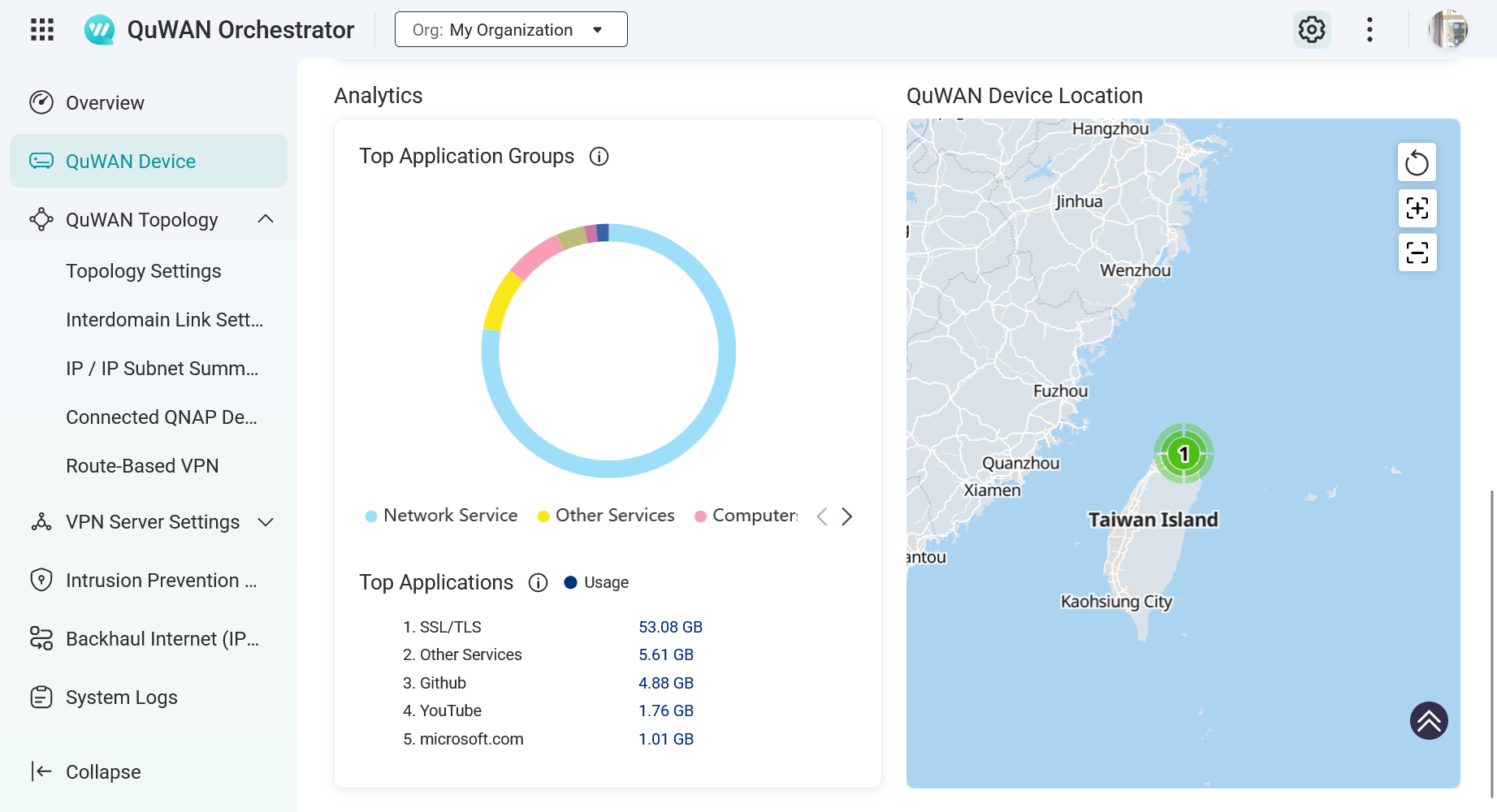 圖說一:透過雲端的 QuWAN Orchestrator 平台,管理者可以一目了然地掌握所有納管的 QHora 路由器地理位置與拓撲狀態,實現跨分點的集中化管理。