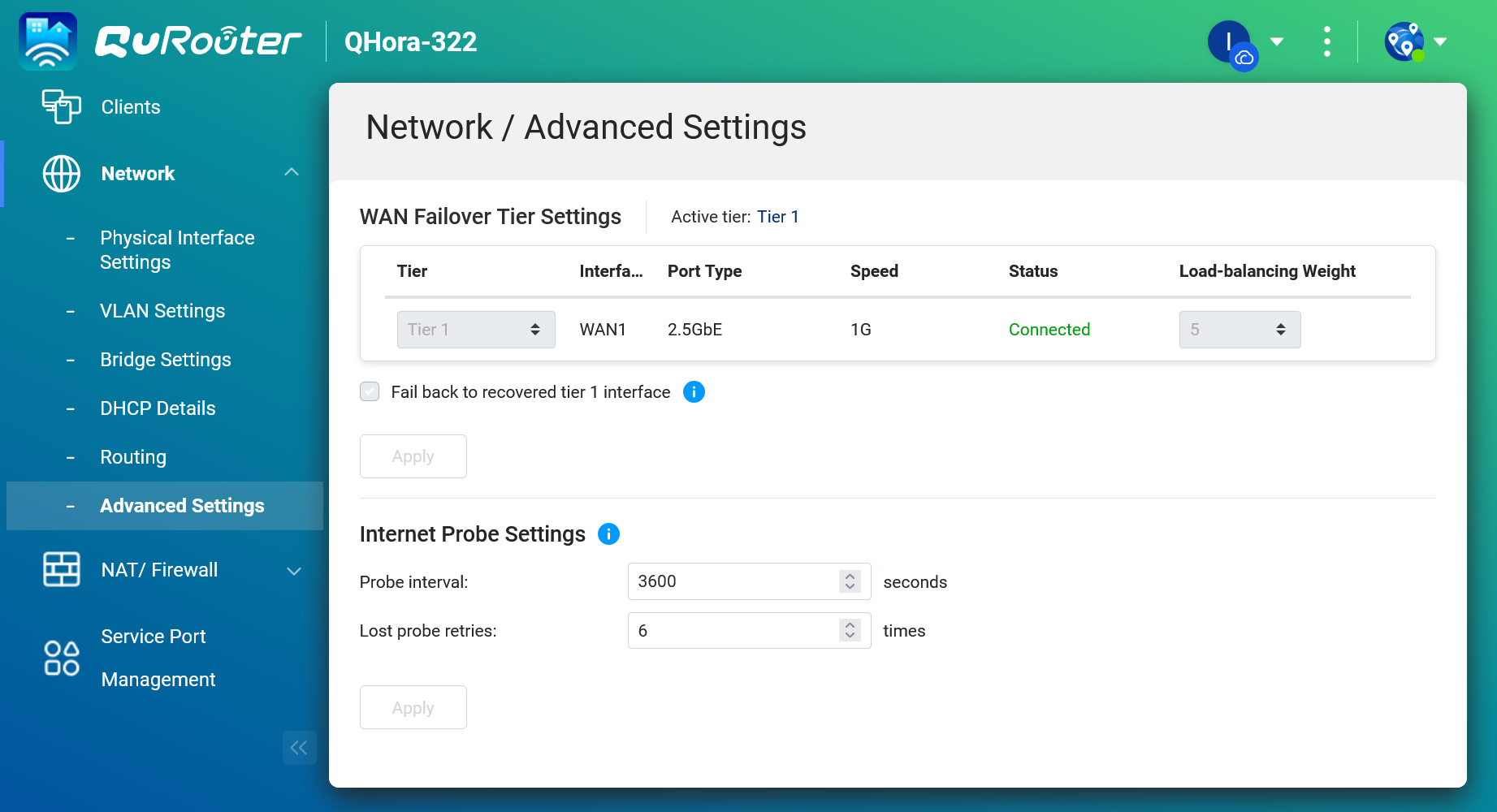圖說十五:在網路的實體介面設定中,QHora-322 提供了非常直覺的圖形化介面,讓管理者能一眼判斷各個連接埠的狀態。此圖顯示 Port 1 作為 WAN 埠,類型為 2.5GbE,並能即時監看上傳與下載流量。