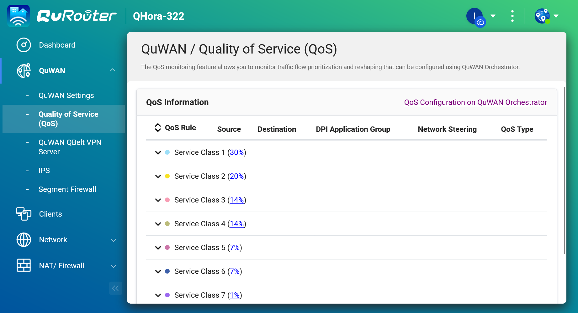 圖說十三:QoS (服務品質) 的規則主要在 QuWAN Orchestrator 上設定,但在本地路由器介面中,管理者可以即時監控不同服務等級 (Service Class) 的流量佔比,確保關鍵應用的網路頻寬得到優先保障。