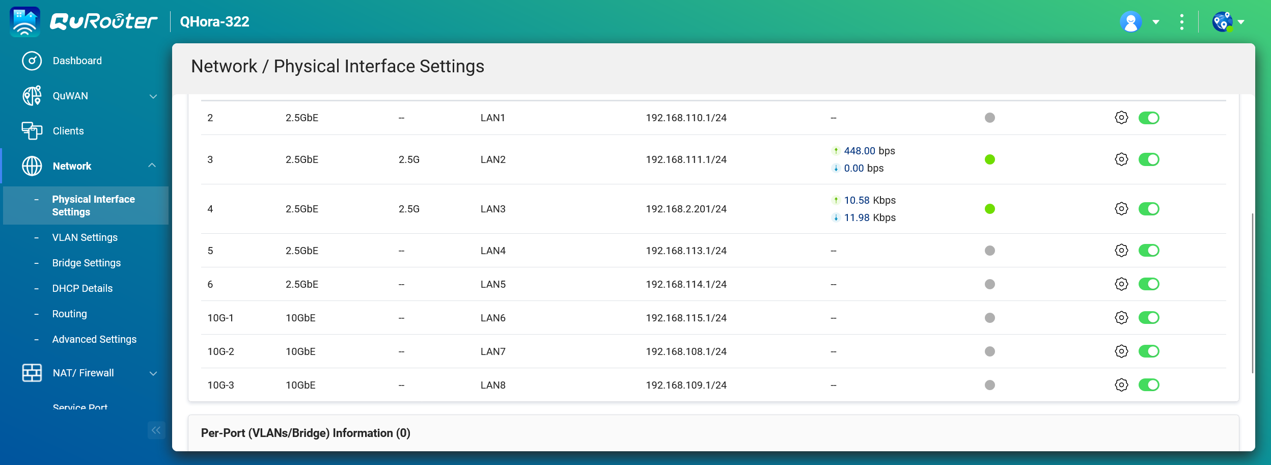 圖說十六:延續實體介面設定,這裡詳細列出了所有 LAN 埠的配置。QHora-322 提供了多個 2.5GbE 與 10GbE 高速連接埠,可彈性連接各式需要高頻寬的裝置,如 NAS、影音工作站或核心交換器,並為每個 LAN 介面指派獨立的網段。